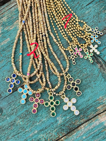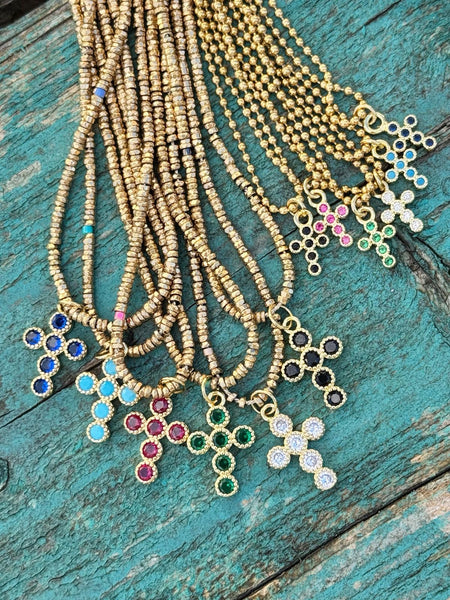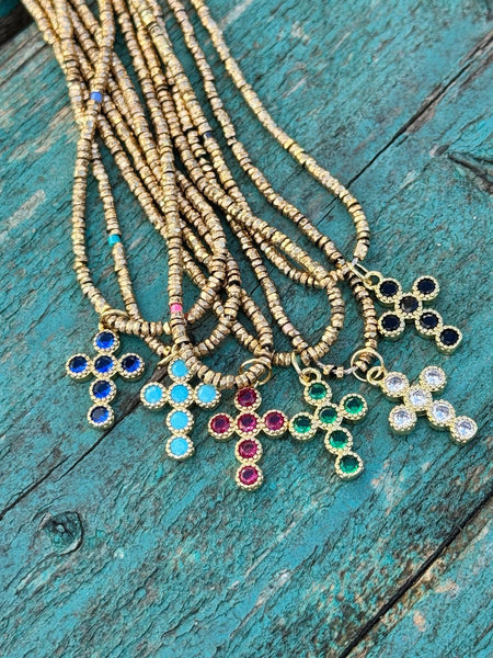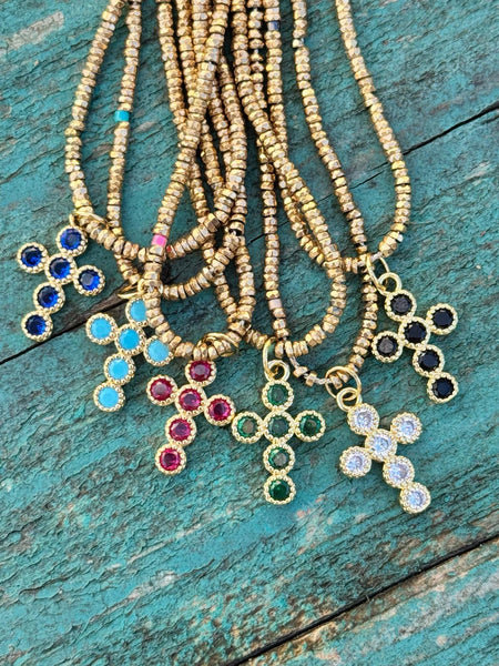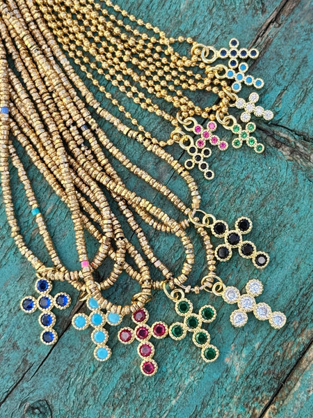 Collier sur fil avec perles hématite - longueur 45cm - croix 17 mm (6 coloris)