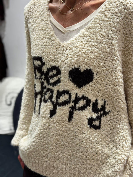 - Motif « Be ♥ Happy » en laine bouclette contrastée bordeaux foncé