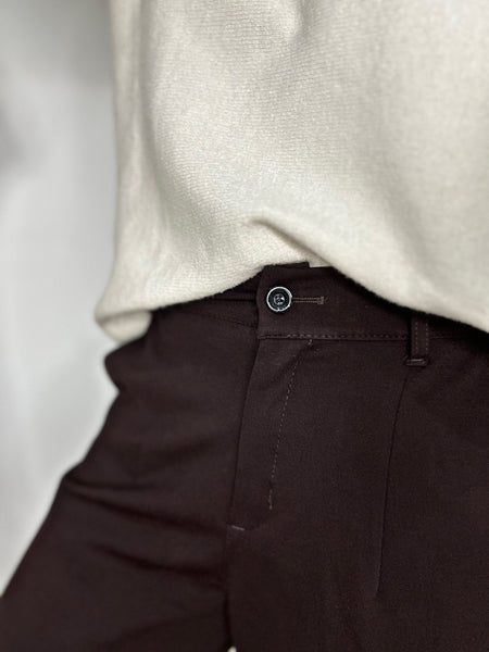 • Ceinture plate, élastiquée au dos, sans braguette apparente