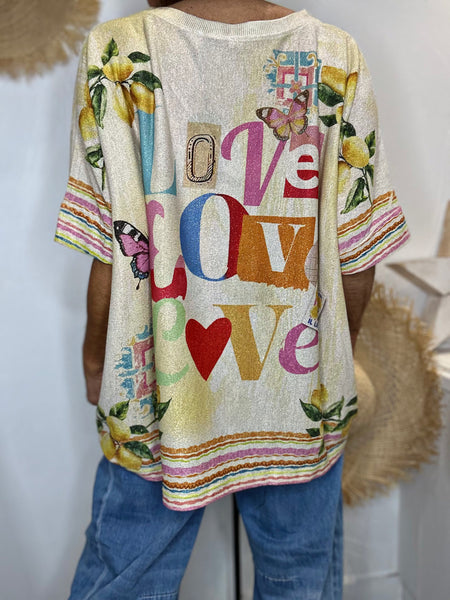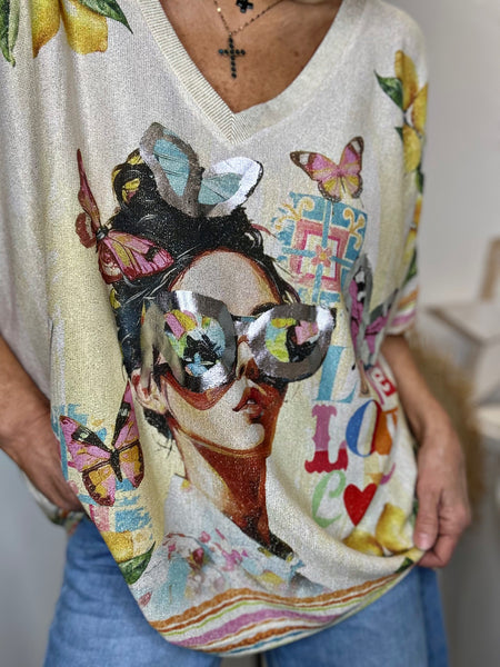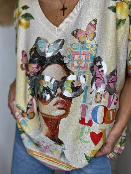 - Illustration visage et papillons devant, motif “Love” au dos