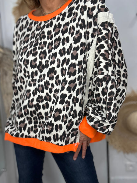 - Coloris : Imprimé léopard noir et choco sur fond écru contrasté avec bords-côtes orange fluo